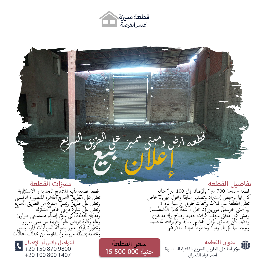 إعلان بيع قطعه أرض ومبنى مميز على الطريق السريع تفاصيل القطعة قطعة مساحة 700 متر2 بالإضافة إلى 100 متر2 منافع كان لها ترخيص إستيراد وتصدير سابقا ومحول كهرباء خاص تطل القطعة على ثلاث وجهات طرق رئيسية نمرة 1 بها مبنى خرسانى دورين (2 محل + شقة كاملة التشطيب) ومبنى كبير مغلق سقف كمرات حديد وصاج وله مدخلين وفضاء كان به منزل كرفان خشبى سابقا وتم إزالته للتجديد ويوجد بها كهرباء ومياة وخطوط للهاتف الأرضى مميزات القطعة قطعة تصلح لجميع المشاريع التجارية و الإستثمارية تطل على الطريق السريع القاهرة المنصورة الرئيسى وتطل على طريق رئيسى متفرع من الطريق السريع وتطل على شارع فرعى خاص مشترك ومقابلة للقطعة التى سيتم إنشاء مستشفى طوارئ وعام وكلية تمريض عليها وقريبة من مبنى المرور ومجاورة لمركز غبور لصيانة السيارات المرسيدس ومحاطة بمنطقة حيوية وإستثمارية من مختلف المجالات عنوان القطعة مركز أجا على الطريق السريع القاهرة المنصورة أمام فيلا الفخرانى للتواصل واتس أو الإتصال 01508709800 01008001407