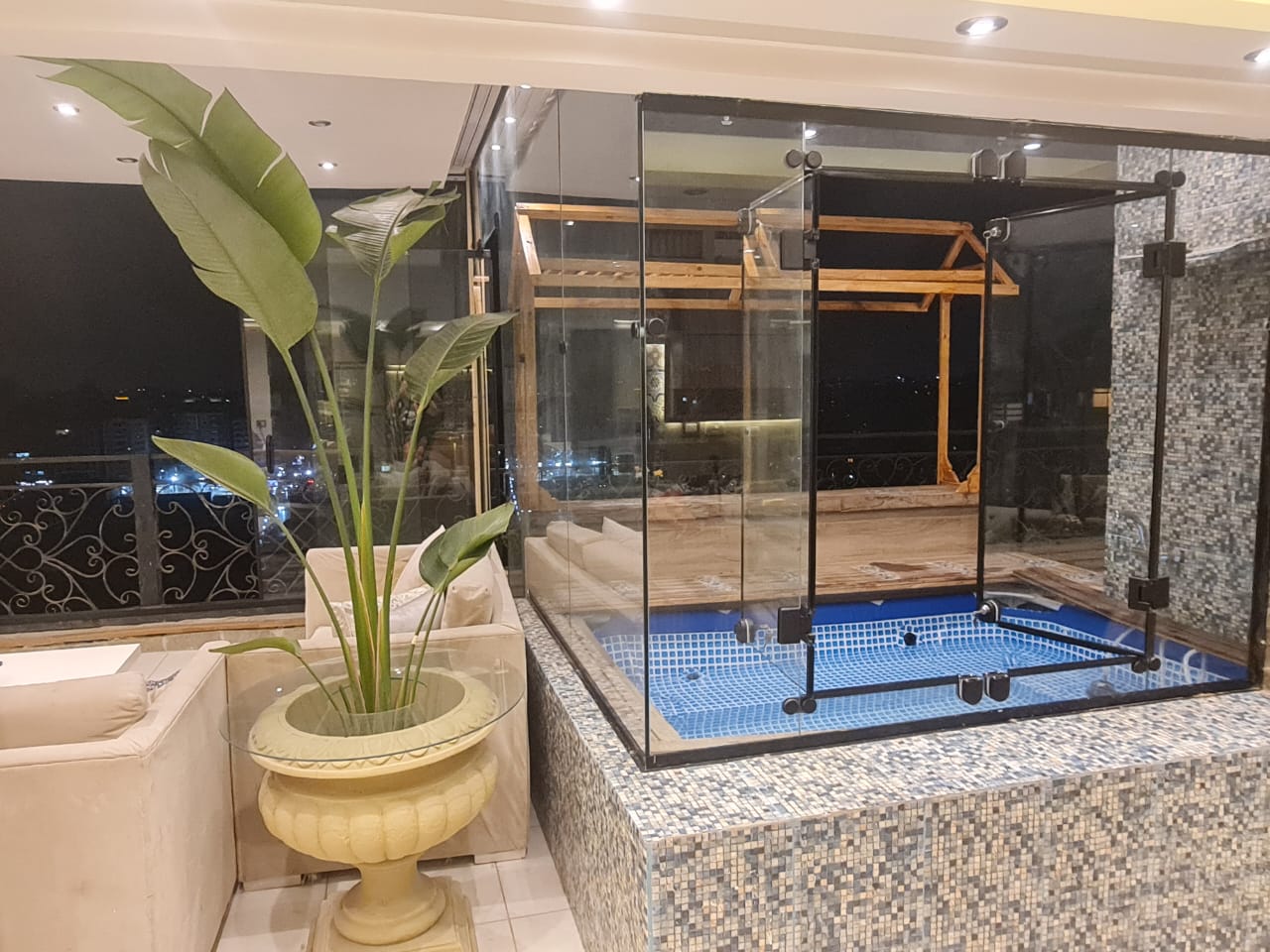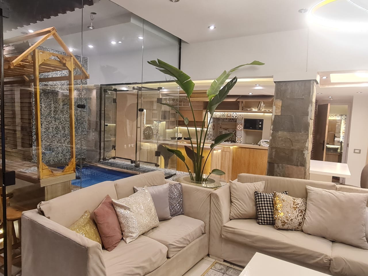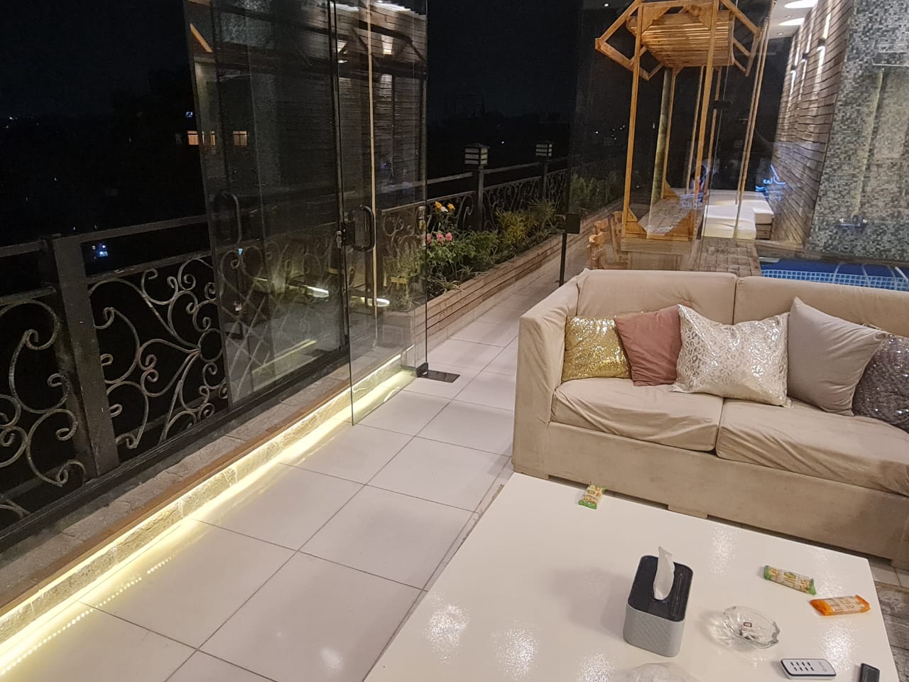 شقة للايجار في الدقي موقع مميز جدا اطلالة مميزة بنت هاوس 2 نوم كل غرفة ماستر بحمام خاص ودريسنج روم ..و توجد مساحة خارجية محاطة بالزهور والنباتات تروى اتوماتيكيا و تحتوي على حمام سباحة صغير وتجهيزات للشواء وسرير مرجيحة وجلسه خارجية بالاضافة لشاشة سمارت 65 بوصة وسماعات هوم ثييتر بلو توث .. فرش فندقي يخضع لمعايير التنظيف والتعقيم المعتمدة يوجد wifi
