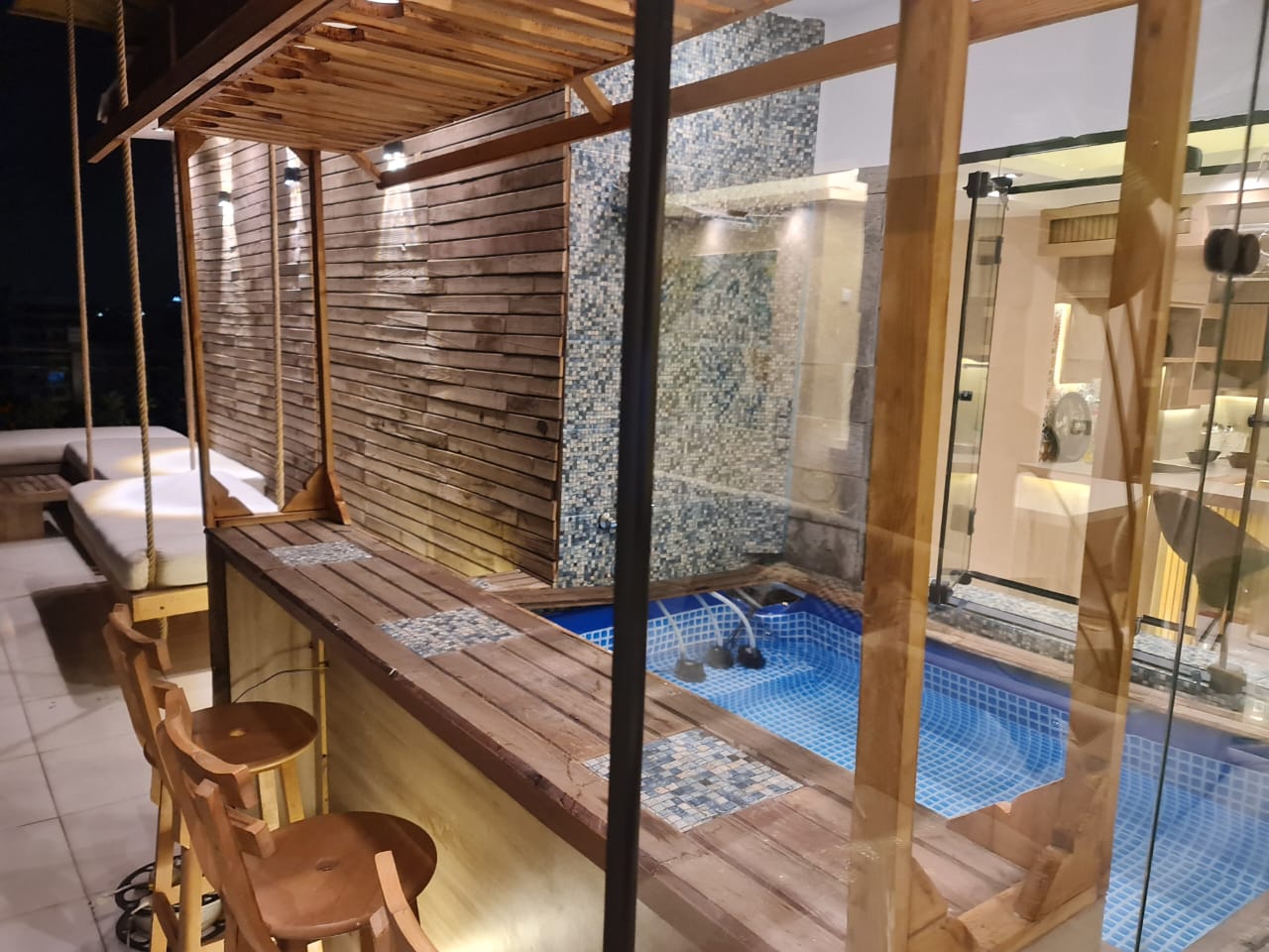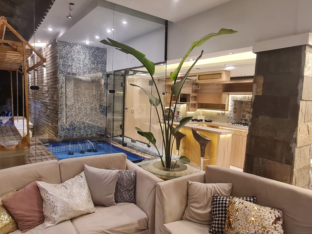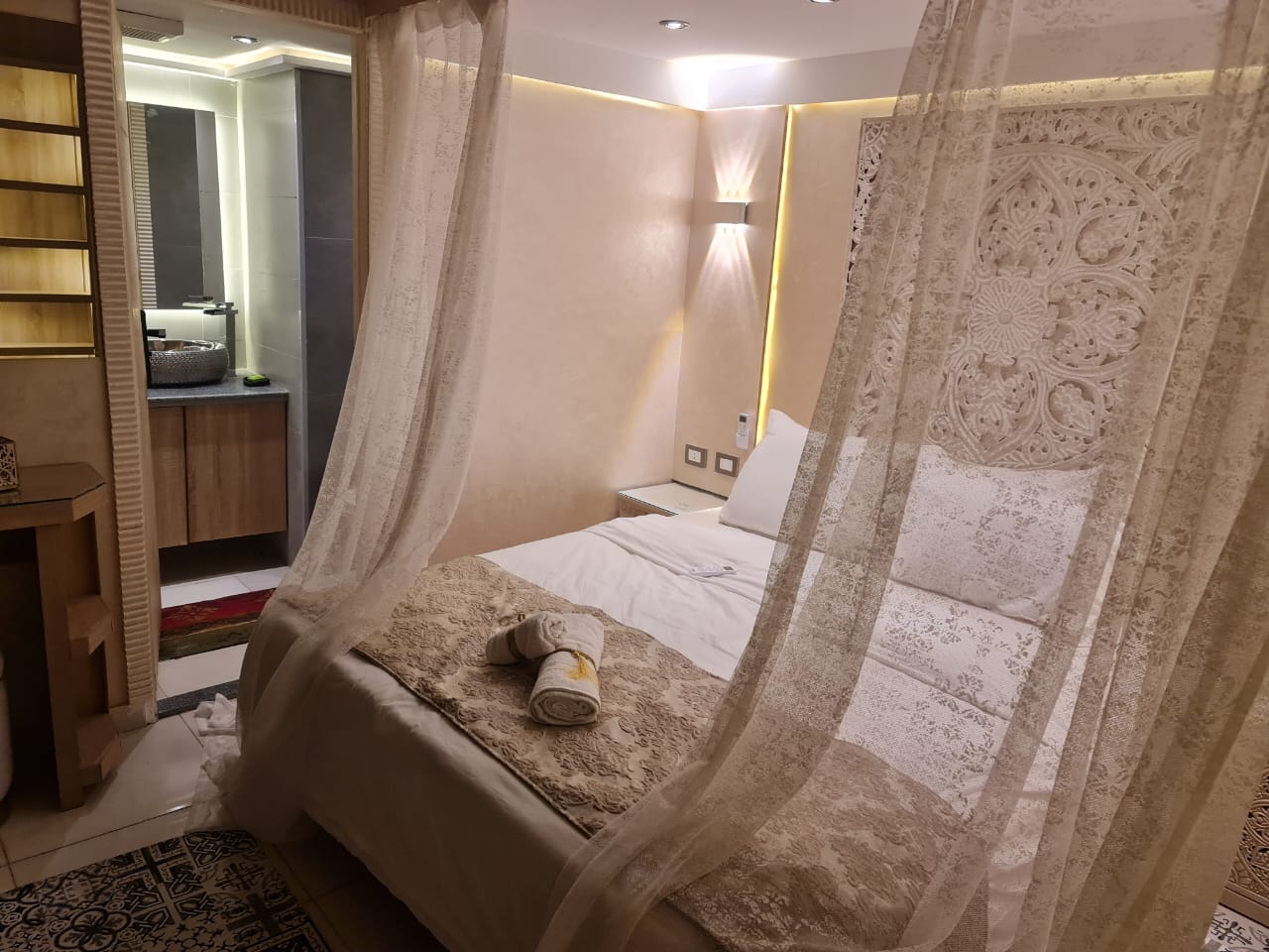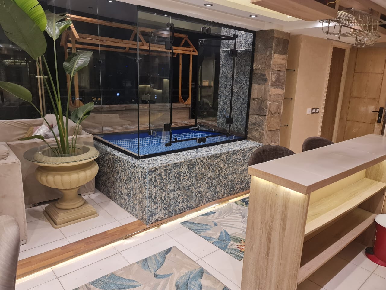 شقة للايجار في الدقي موقع مميز جدا اطلالة مميزة بنت هاوس 2 نوم كل غرفة ماستر بحمام خاص ودريسنج روم ..و توجد مساحة خارجية محاطة بالزهور والنباتات تروى اتوماتيكيا و تحتوي على حمام سباحة صغير وتجهيزات للشواء وسرير مرجيحة وجلسه خارجية بالاضافة لشاشة سمارت 65 بوصة وسماعات هوم ثييتر بلو توث .. فرش فندقي يخضع لمعايير التنظيف والتعقيم المعتمدة يوجد wifi
