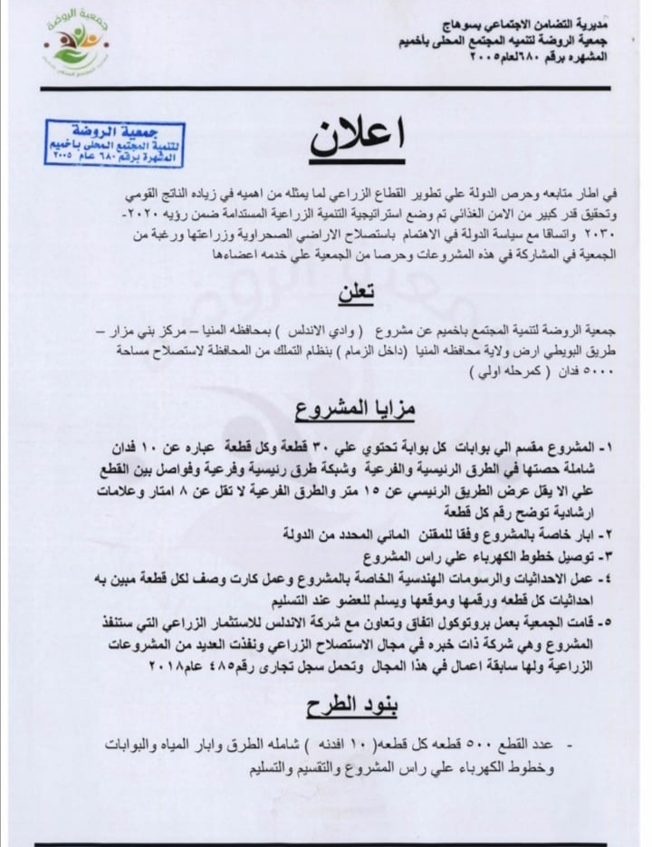 للبيع ايصال جمعية الروضة لضباط الشرطة ✨مشروع وادي الاندلس بالمنيا✨ ✨ بمحافظة المنيا مركز بني بمزار طريق البويطي ✨10 كيلو متر من الصحراوي الغربي📍 ✨ 10 فدان تخصيص جمعية الروضة لضباط الشرطة👮🏻♂️ ✨تفاصيل ✨ 👈🏻بوابة و مدخل خاص بطول 6 كيلو متر وعرض 20 متر بتجاهين 👈🏻تربة طميية مسطحة تماماً 👈🏻تتميز الارض بجودتها و امكانية زراعة جميع المحاصيل 👈🏻قرب المياه و الانتاجية العالية للأبار 👈🏻قرب الخدمات الاساسية و خدمات الميكنة الزراعية ✨الاسعار ونظام الدفع✨ 👈🏻 اجمالي سعر الارض 300 الف ✨نظام السداد ✨ 👈🏻مقدم حجز ( 100,000 ) مائة الف جنيه (تم سداده من خلال العضو) 👈🏻يتم سداد باقي ثمن قطعة الارض 10 فدان 50 الف كل 3 شهور اقساط ✨الاستلام بعد 6 شهور ✨ ✨استلام القطعة جاهزة علي الزراعة -ابار مياه - كهرباء -خدمات اتصالات ------- إزاي تقدر تستفيد من القطعة أولا :بعد الاستلام تقدر تبيع القطعة مش أقل من مليون جنيه (100 ألف للفدان لأنها هتكون كاملة المرافق وجاهزة للزراعة ومياة وكهرباء _التفاصيل 01027324645 واتس
