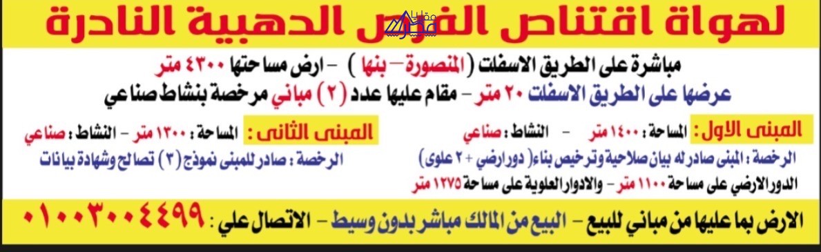لهواة اقتناص الفرص الذهبية النادرة مباشرة على طريق (المنصورة – بنها ) السريع ارض مساحتها 4300 متر عرضها على الطريق الاسفلت 20 متر مقام عليها عدد (2) مبانى مرخصة بنشاط صناعي المبنى الاول : المساحة : 1400 متر النشاط : صناعي الرخصة : المبنى صادر له بيان صلاحية وترخيص بناء( دور ارضي + 2 علوى) الدور الارضي على مساحة 1100 متر والادوار العلوية على مساحة 1275 متر المبنى الثانى : المساحة : 1300 متر النشاط : صناعي الرخصة : صادر للمبنى نموذج (3) تصالح وشهادة بيانات الارض بما عليها من مبانى للبيع