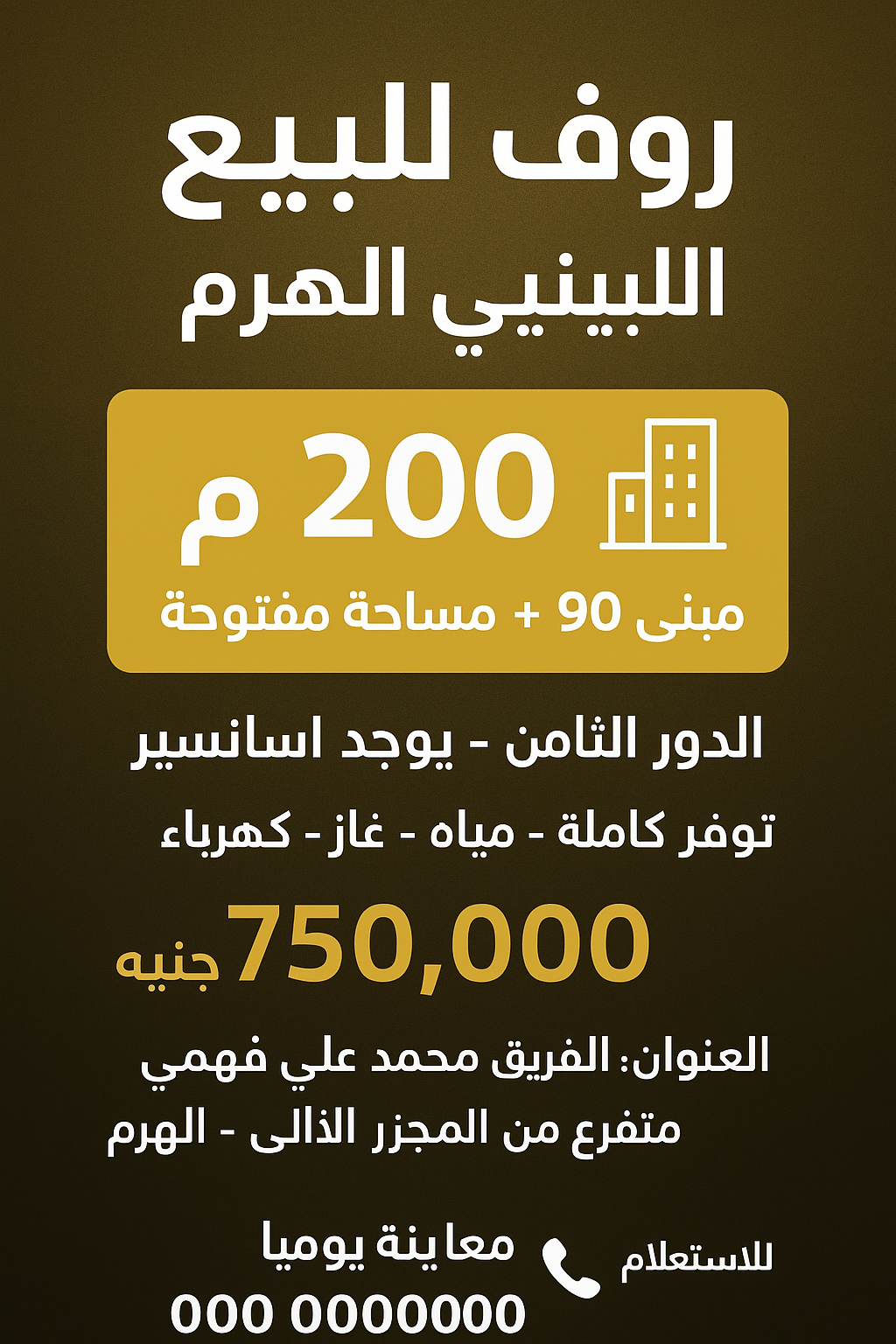 🔥 فرصة مش هتتعوض 🔥 روف مميز للبيع في موقع استراتيجي باللبيني – الهرم 👌 🏠 المساحة: 200 متر ✅ مبني 90 متر + مساحة مفتوحة المشتري يقسمها زي ما يحب 📍 الدور الثامن – مبنى حديث + اسانسير 💡 كامل المرافق: مياه – كهرباء – غاز طبيعي ✨ مميزات العقار: موقع حيوي جدًا مساحة مفتوحة مثالية للتقسيم أو الاستثمار متاح معاينة يوميًا 💰 السعر المطلوب: 750,000 جنيه فقط 🔥 📍 العنوان: الفريق محمد علي فهمي – متفرع من المجزر الآلي – اللبيني – الهرم 📞 للاستعلام: 01223621734