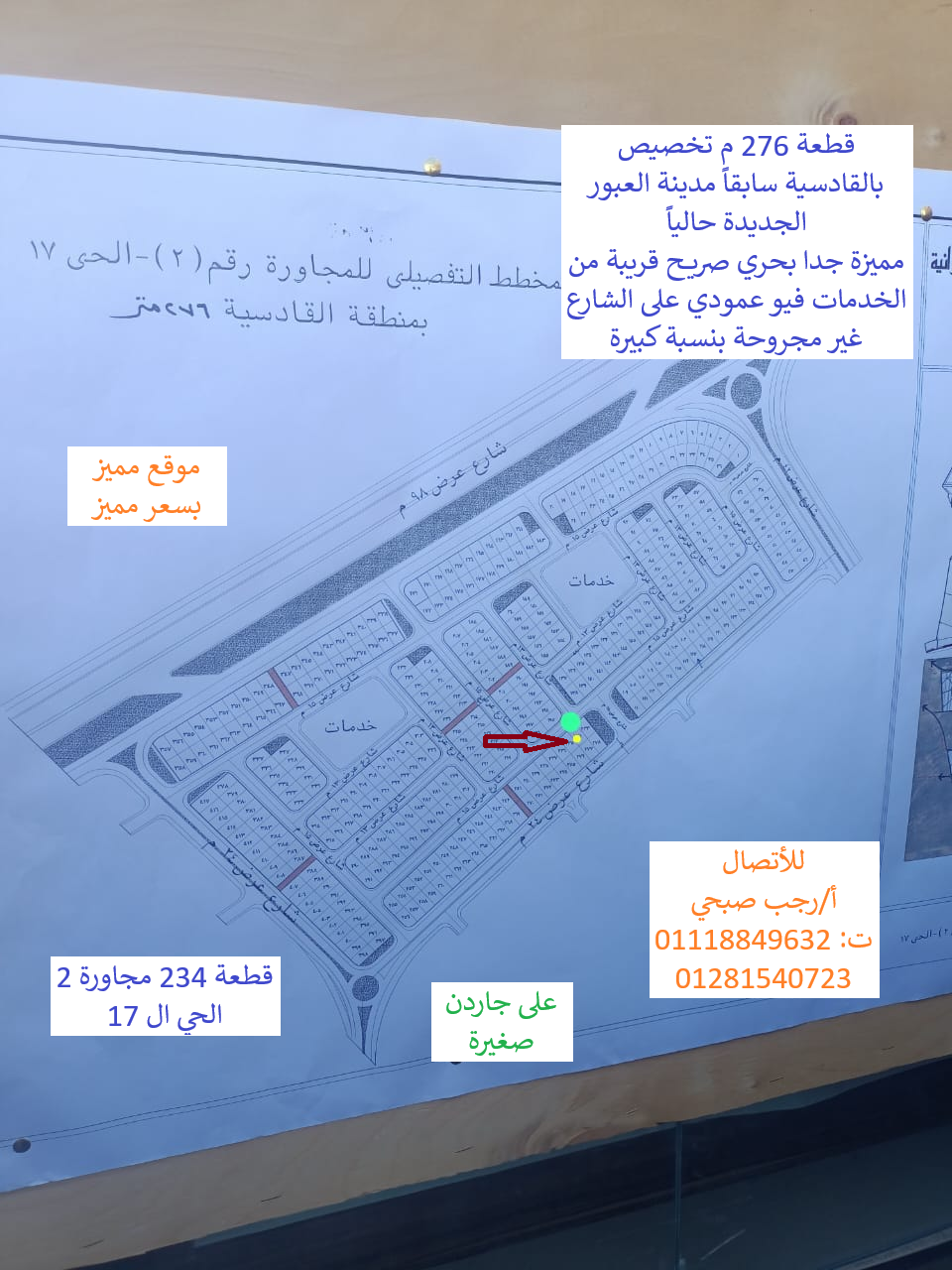 من المالك مباشره. للبيع قطعه ارض. مساحه 276 متر القادسيه سابقا مدينه العبور الجديدة حاليا خطاب تخصيص من جهاز مدينه العبور الجديدة اصل المساحه 300 متر سعر مميز. للتواصل واتس وفون 01281540723