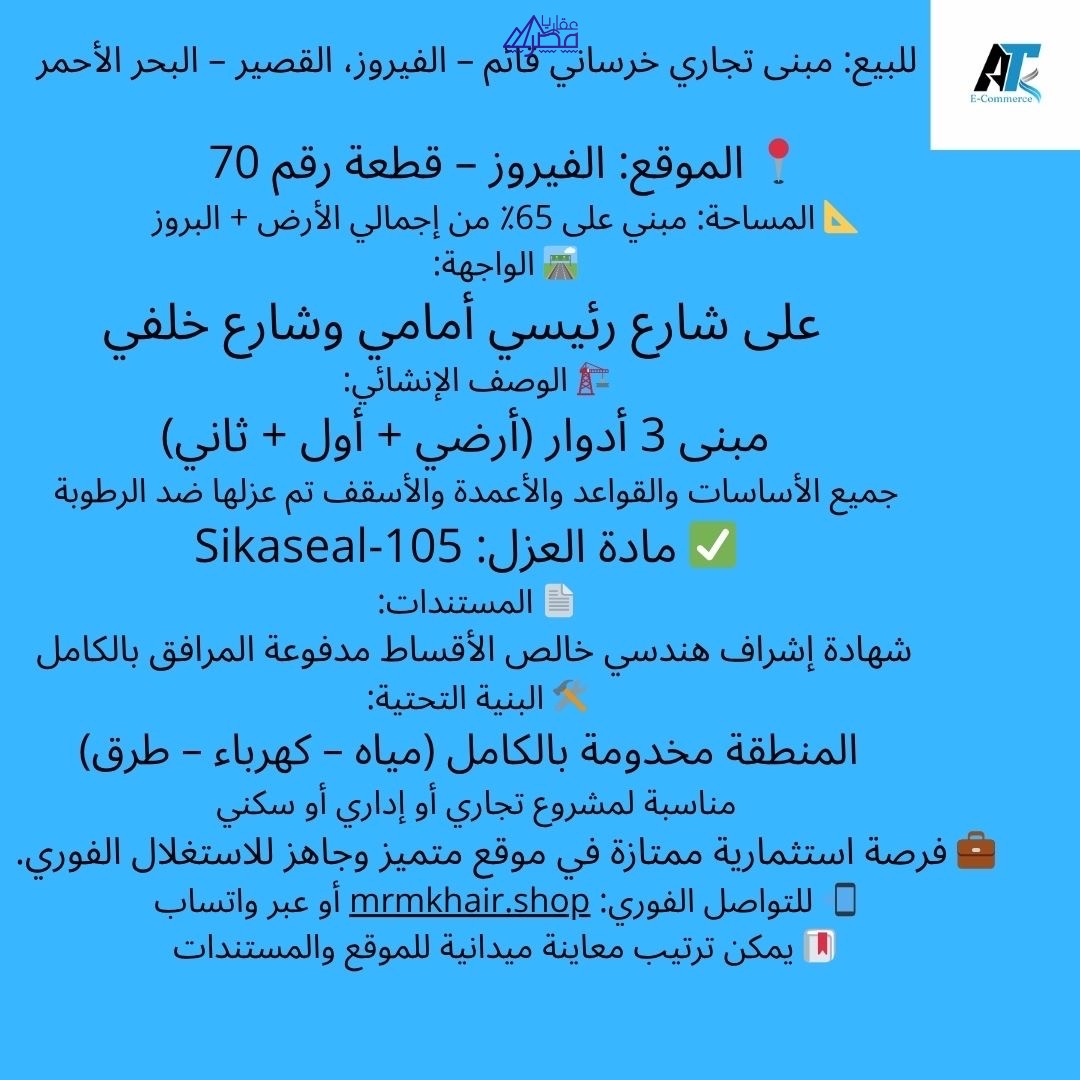 فرصة ذهبية للاستثمار – مبنى تجاري جاهز للبيع في الفيروز، القصير 📍 الموقع: الفيروز – قطعة رقم 70 📐 المساحة: 151 متر مربع – المبني قائم نسبة البناء 65% من إجمالي المساحة الكلية + البروز 🧱 الوصف الإنشائي: مبنى خرسانى مكون من 3 أدوار (أرضي + أول + ثاني) ✔️ الأساسات والقواعد والأعمدة والأسقف منفذة بالكامل ✔️ عزل ضد الرطوبة باستخدام مادة Sikaseal-105 ✔️ على شارع رئيسي أمامي وشارع خلفي ✔️ جميع المرافق (مياه – كهرباء – طرق) متوفرة بالكامل ✔️ بإشراف هندسي مع شهادة استلام هندسية رسمية ✔️ خالص الأقساط، وجميع المرافق مدفوعة بالكامل 🏢 مناسب لمشروع تجاري – إداري – سكني – عيادة – صيدلية – مكتب أو شركة 👜 فرصة استثمارية جاهزة للاستغلال الفوري في موقع حيوي ومميز ✅ المميزات: • تقع في منطقة راقية من مشروعات الفيروز • متوفر جميع المرافق و الخدمات • مناسبة للاستثمار أو البناء الفوري • أوراق موثقة وجاهزة للتسجيل العقاري 💵 السعر المطلوب: 2 مليون و 700 الف جنيه مصري 📞 للتواصل والاستفسار: 📞 اتصال مباشر 🌐 https://mrmkhair.shop