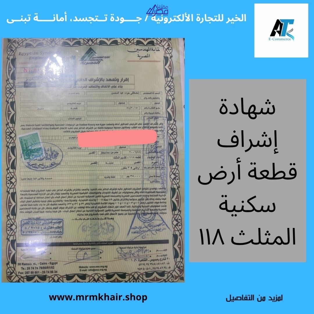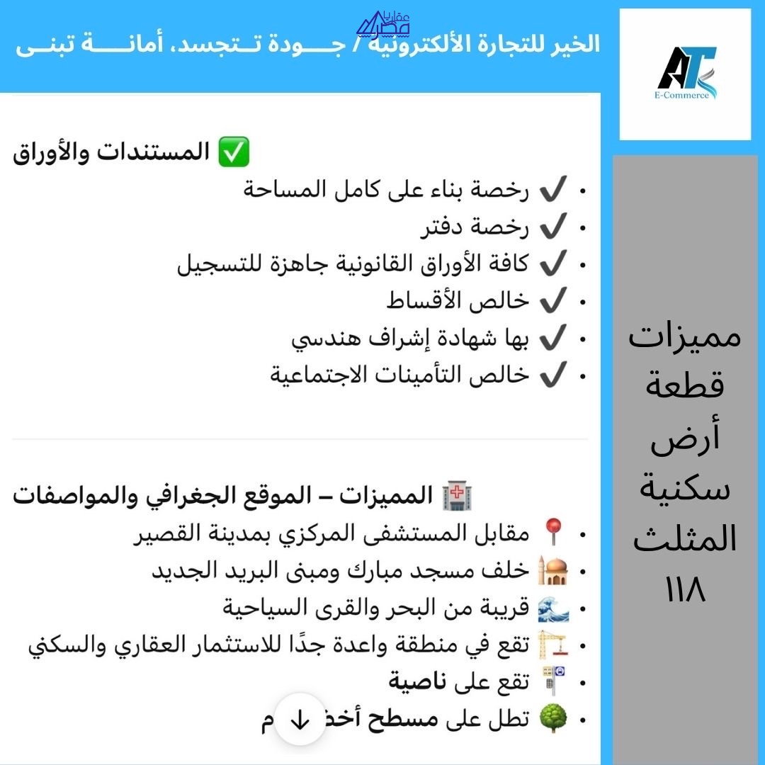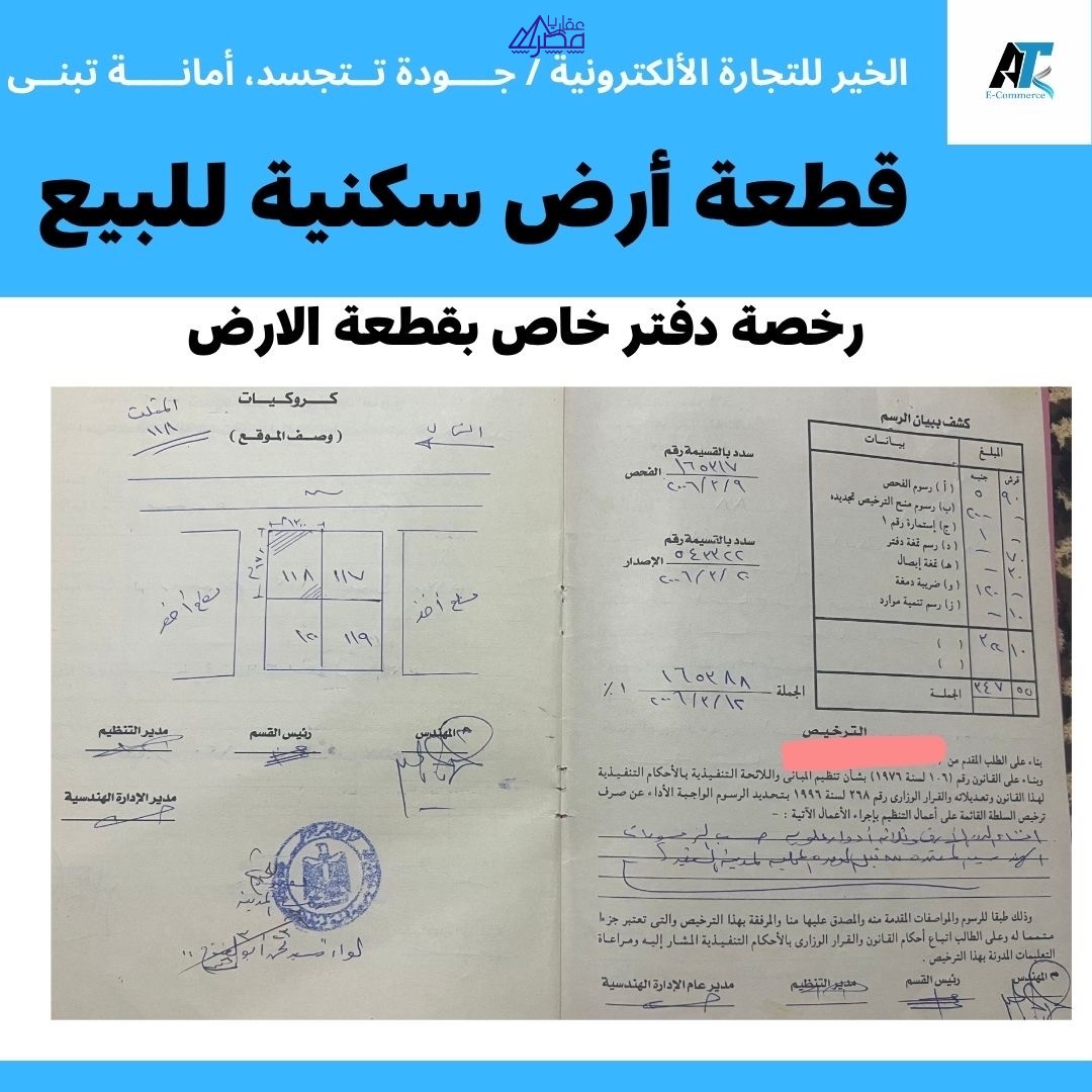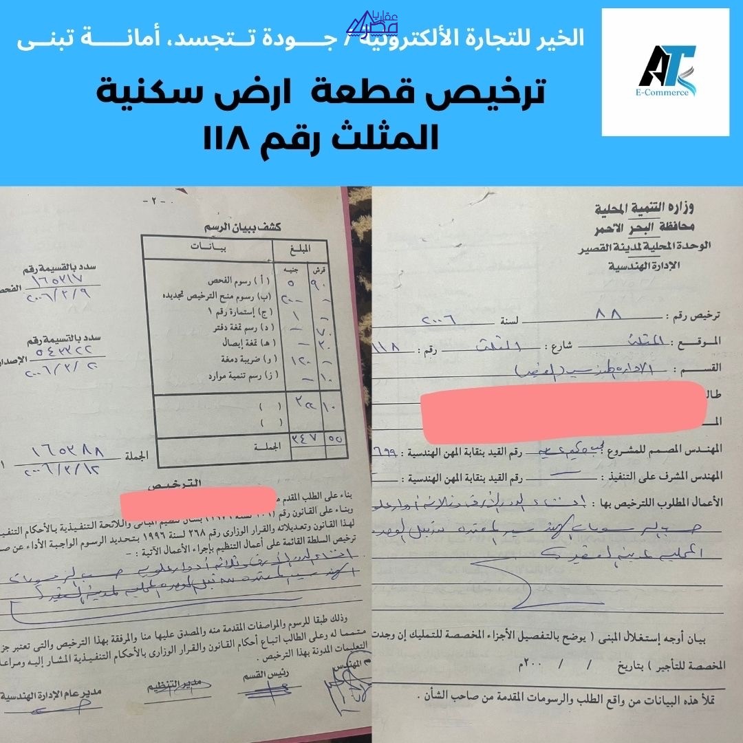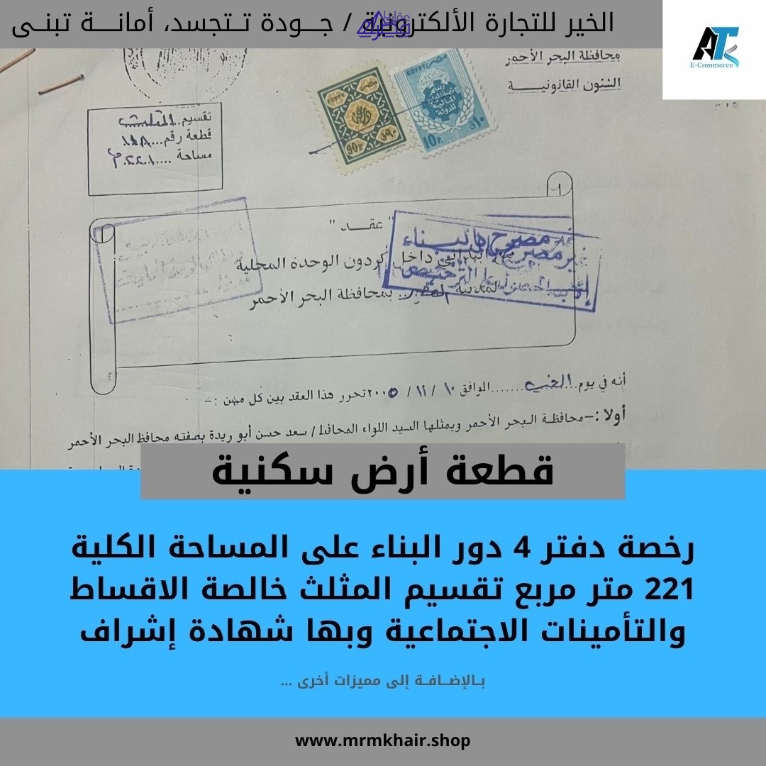 🏡 فرصة استثمارية ممتازة – أرض سكنية في القصير – البحر الأحمر 📍 المنطقة: مدينة القصير – حي المثلث – قطعة رقم 118 🏷️ نوع الأرض: سكنية 📝 نوع الترخيص: رخصة بناء على كامل المساحة 4 دور 📐 مساحة الأرض: 221 متر مربع 📏 مساحة الترخيص: بناء على كامل المساحة 🏢 عدد الأدوار المسموح بها: 4 أدوار 🏘️ التقسيم: حي المثلث – قطعة 118 💰 خالص الأقساط: ✅ نعم 📝 بها شهادة اشراف: ✅ نعم 🧾 خالص التأمينات الاجتماعية: ✅ نعم 📚 كامل الأوراق القانونية: ✅ جاهزة للتسجيل 💵 السعر المطلوب: 750,000 جنيه مصري 📞 للتواصل والاستفسار: 📞 اتصال مباشر 🌐 https://mrmkhair.shop ✨ موقع مميز للاستثمار العقاري