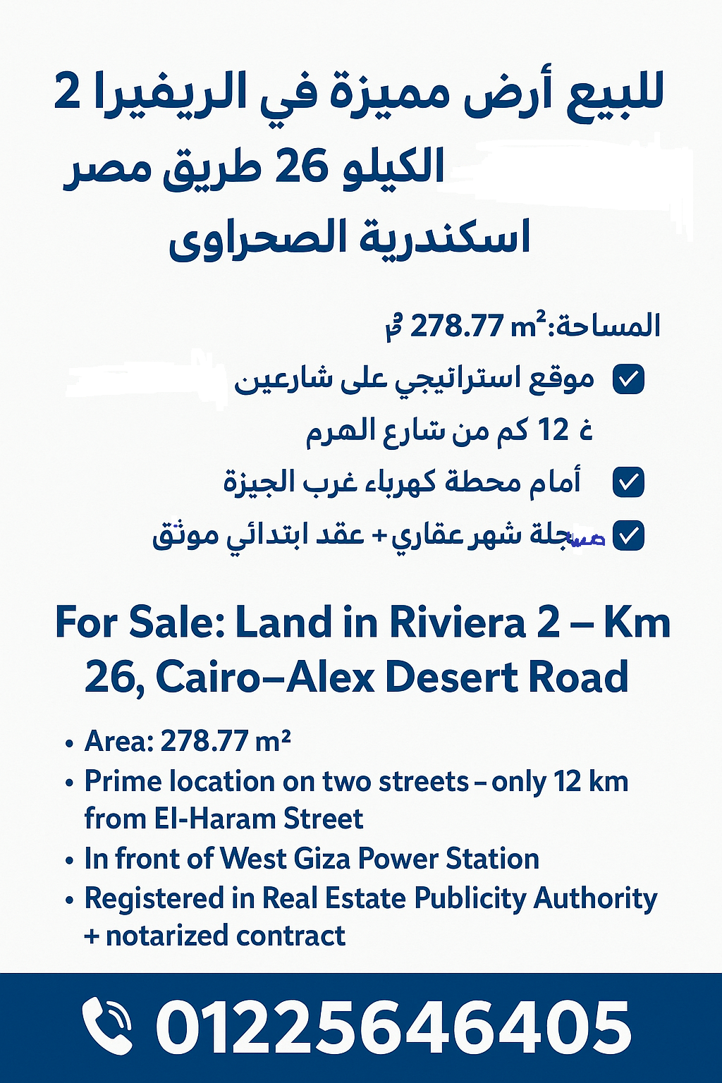 📍 للبيع أرض مميزة في الريفيرا 2 – الكيلو 26 طريق مصر إسكندرية الصحراوي • المساحة: 278.77م² • موقع استراتيجي على شارعين – تبعد 12 كم من شارع الهرم - أمام محطة كهرباء غرب الجيزة • مسجلة شهر عقاري + عقد ابتدائي موثق • السعر: 5,000 جنيه للمتر 📞 للاتصال: 01225646405