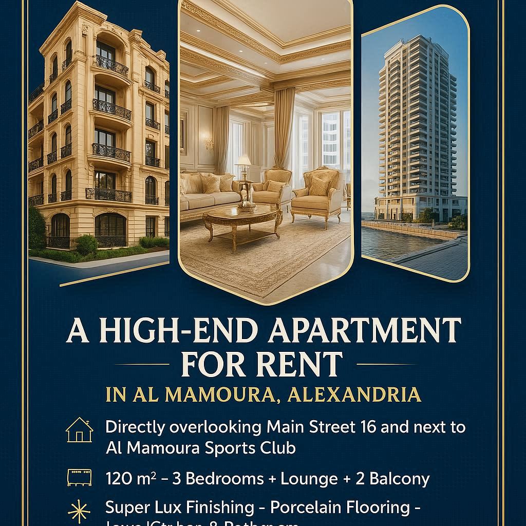 🏡 للإيجار قانون جديد بالمعمورة شقة راقية 120م، 3 غرف وصالة، سوبر لوكس، واجهة بحرية بإطلالة على شارع 16 بجوار نادي المعمورة الرياضي. 🏢 الدور الخامس بأسانسير، 2 بلكونة، عمارة نظيفة بها بوّاب، قريبة من الخدمات والمواصلات. 💰 إيجار سنوي، يُفضل أسرة صغيرة محترمة – 📞 واتساب: 01012412542. #شقق_للإيجار #المعمورة #الإسكندرية