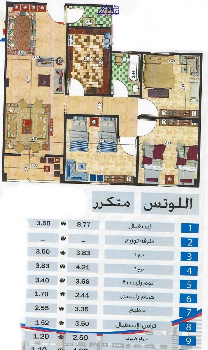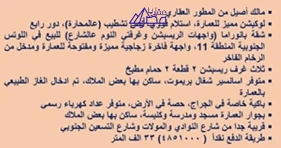 شقة بانوراما متميزة (واجهة ريسبشن وغرفتين موم على الشارع الرئيس) نص تشطيب باللوتس الجنوبية دور رابع وليس أخير أسانسر . ثلاث غرف وحمامين ومطبخ