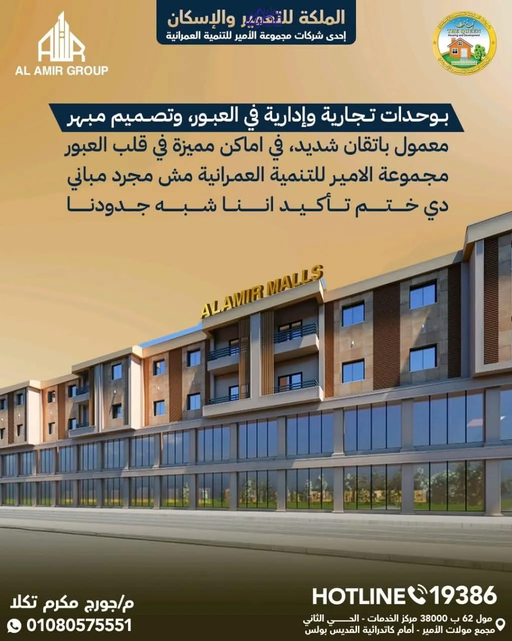 شقة فندقية تحت الإنشاء للبيع في العبور الحي الثاني بجوار مسجد القدس مول الأمير الحي الثاني المول عبارة عن أرضي وأول تجاري والثاني إداري والثالث سكني السكني له مدخل خاص وأسانسير خاص التسليم نص تشطيب (محارة وحلوق) مطلوب مليون 650 ألف والباقي 750 ألف على سنة ونص التسليم سنة نهائي